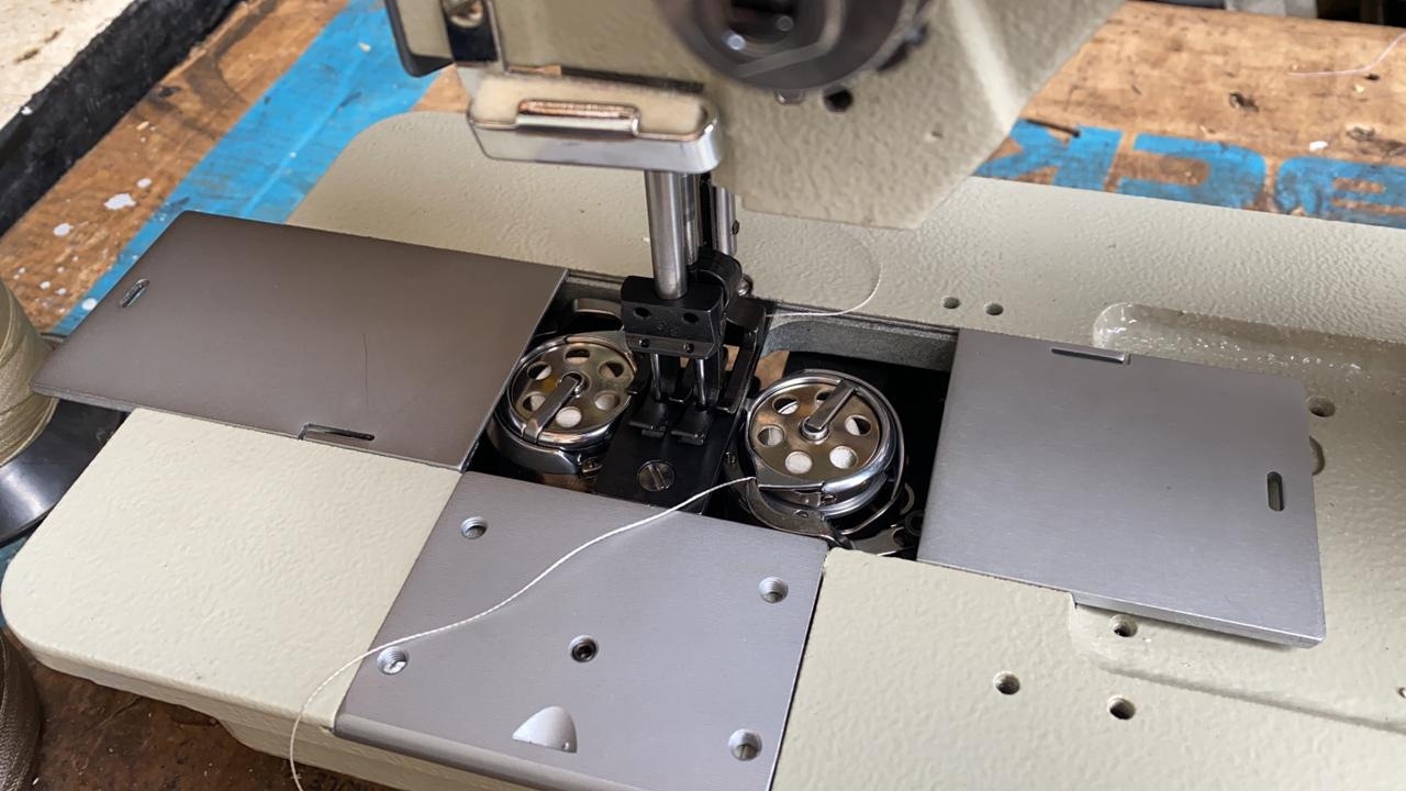 Máquina Reta 2 Agulhas com ponto fixo, lubrificação automática e transporte triplo por Dente calcador e agulha (evita o franzimento do tecido), indicada para materiais pesados como estofados, couros, lonas, sintéticos entre outros.
