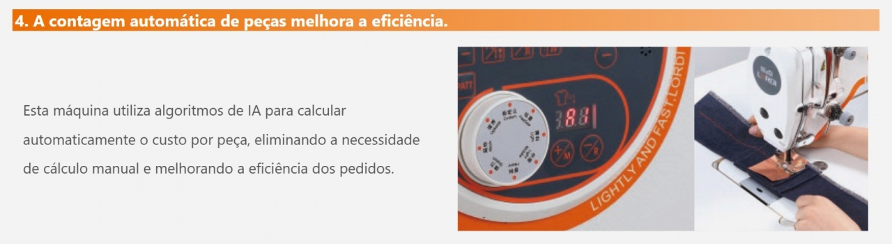 5. Máquina de costura de padrões com motor de passo, silenciosa e com comprimento de ponto ajustável.