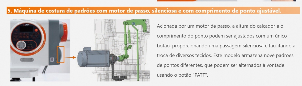 Acionada por um motor de passo, a altura do calcador e o comprimento do ponto podem ser ajustados com um único botão, proporcionando uma passagem silenciosa e facilitando a troca de diversos tecidos. Este modelo armazena nove padrões de pontos diferentes, que podem ser alternados à vontade usando o botão "PATT".