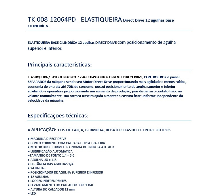 TK-008-12064PD ELASTIQUEIRA Direct Drive 12 agulhas base CILINDRÍCA.