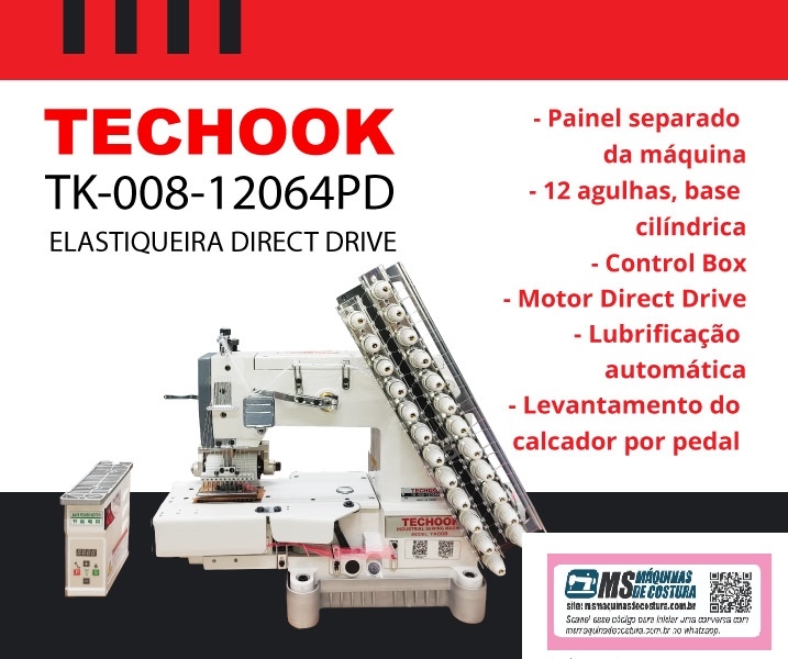 ELASTIQUEIRA / BASE CILINDRINCA 12 AGULHAS PONTO CORRENTE DIRECT DRIVE, CONTROL BOX e painel SEPARADOS da máquina sendo seu Motor Direct-Drive proporcionando mais agilidade e menos ruídos, economia de energia até 70% de consumo, possui posicionamento de agulha superior e inferior auxiliando a operadora proporcionando um aumento de produção, pois dispensa o contato físico ao volante manualmente, sua catraca traseira ajuda a manter a costura ficar uniforme independente da velocidade da máquina.