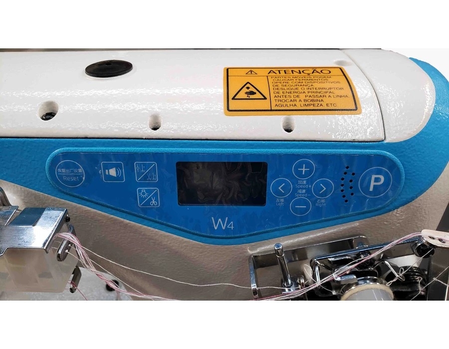 Equipada com Motor Direct-Drive com Função de Posicionador de Agulhas e Controle de Velocidade, com CORTE DE FIO Automático Elétrica, com trançador superior e inferior e Excêntrico da linha do looper externo.