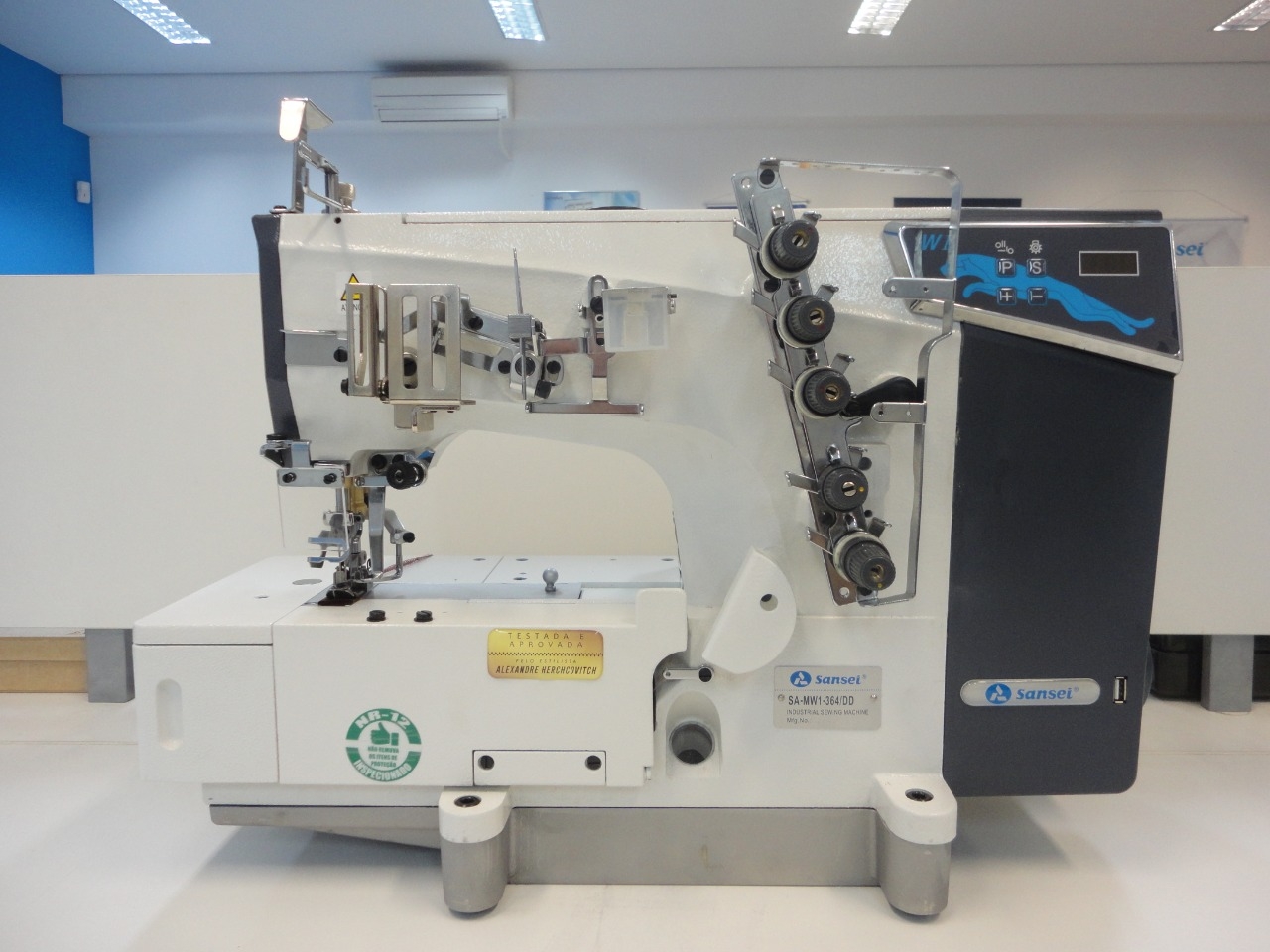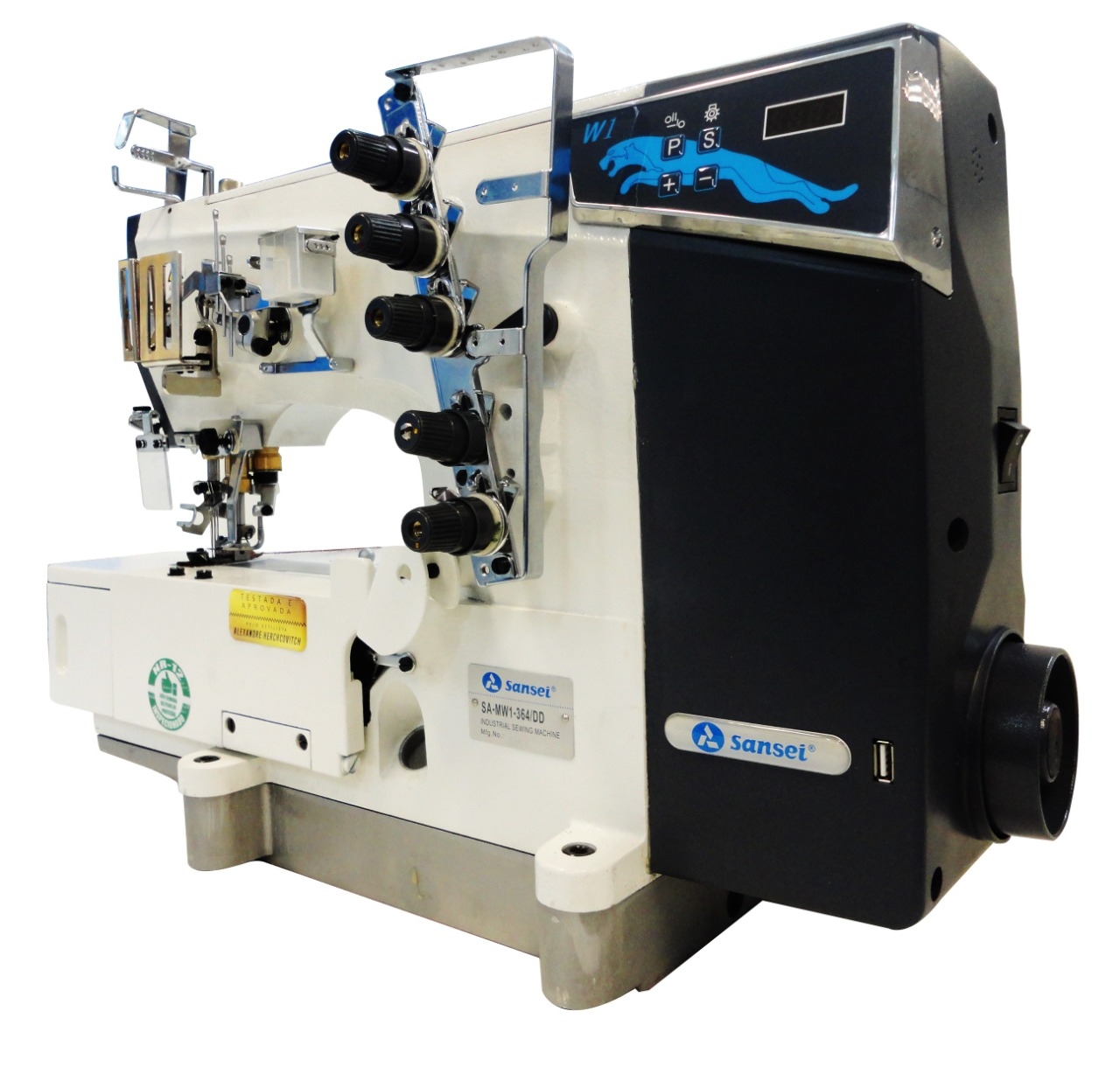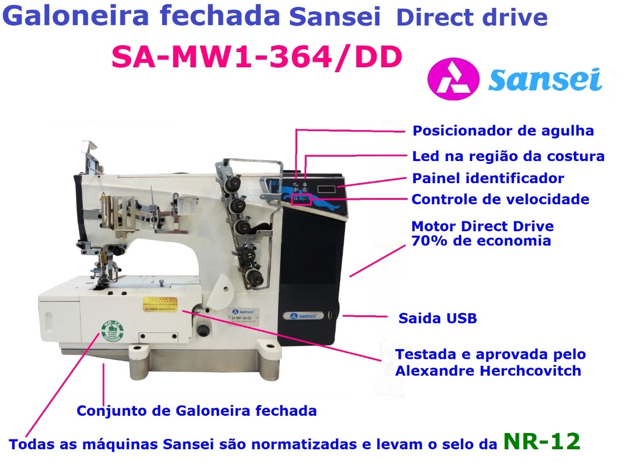 Buscando sempre a inovação a Sansei traz a nova Galoneira SA-MW1-364/DD, com saída USB de 5V, três agulhas, com trançador e motor Direct-Drive.