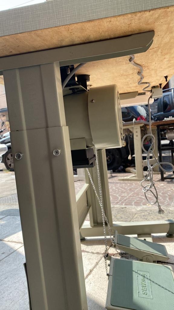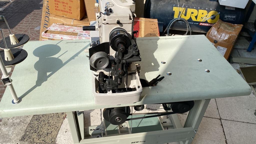 Máquina de costura industrial tipo caseadeira com mesa, estante e motor.