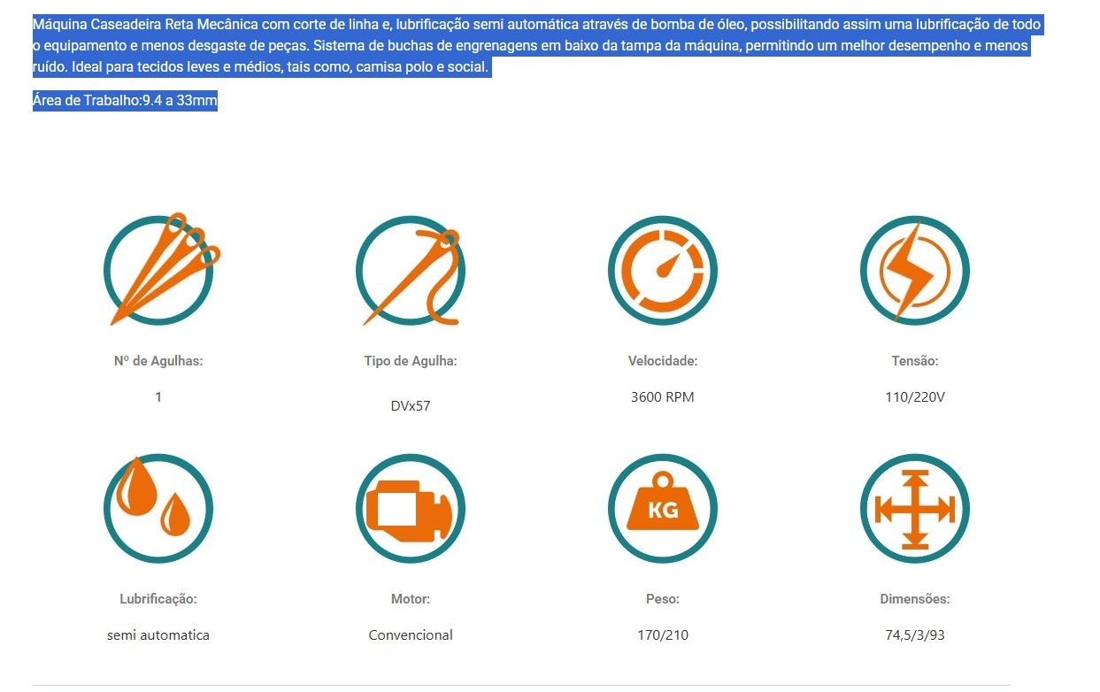 Máquina Caseadeira Reta Mecânica com corte de linha e, lubrificação semi automática através de bomba de óleo, possibilitando assim uma lubrificação de todo o equipamento e menos desgaste de peças. Sistema de buchas de engrenagens em baixo da tampa da máquina, permitindo um melhor desempenho e menos ruído. Ideal para tecidos leves e médios, tais como, camisa polo e social.