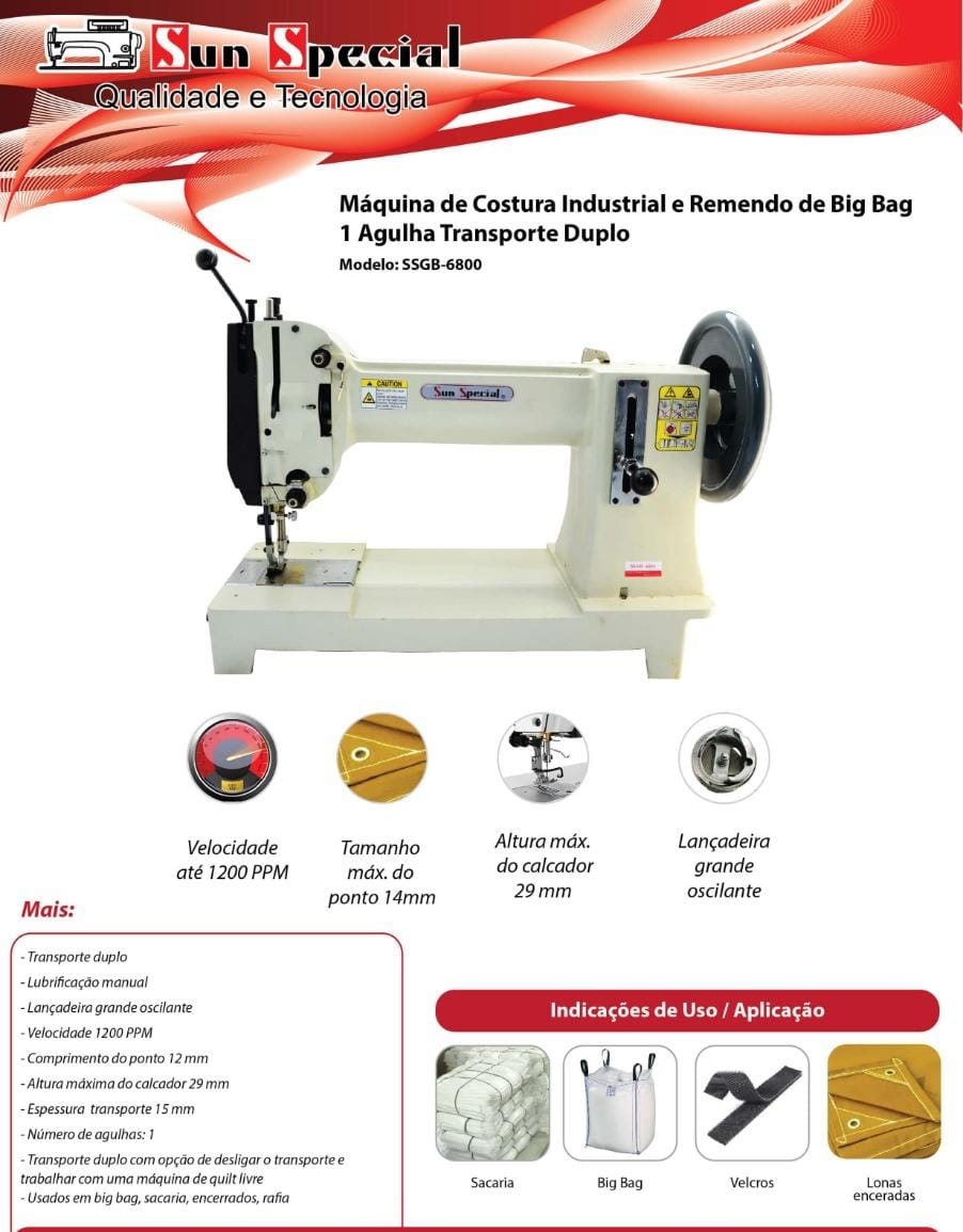 Máquina de Costura Industrial e Remendo de Big Bag SSGB-6800 Utilizada em selaria, sacaria e encerados Velocidade maxima 1000 PPM Tamanho maximo do ponto 12 mm Levantador de calcador 14 / 22mm Lancadeira oscilante