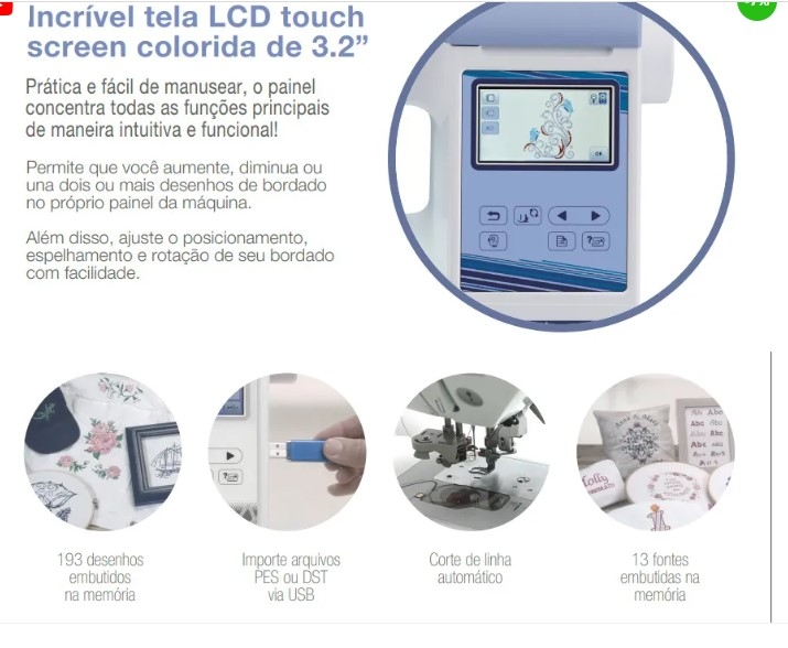 Você pode embelezar os seus trabalhos com 193 desenhos embutidos na memória, que incluem bordados delicados , florais, desenhos clássicos e 13 fontes de letras . Também possui Porta USB para Pen Drive que permite importar bordados adicionais do seu computador sem a necessidade de conectá-lo à máquina,agora com conexão via wfi que permite envio do bordado sem necessidade de conexão via pendrive.