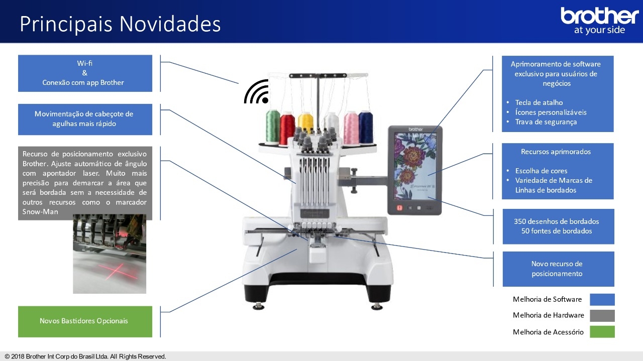 - Conexão Wifi: Quando estiver conectado à sua rede sem fio, envie desenhos do seu PC para a PR680W com Design Database Transfer e receba alertas de quando for a hora de substituir o carretel, ou quebra de linha, e até mesmo quando seu projeto estiver concluído com o aplicativo My Stitch Monitor. Você também pode vincular até 10 máquinas sem fio e obter atualizações das máquinas automaticamente ao usar com o PE-Design 11 (compra adicional).