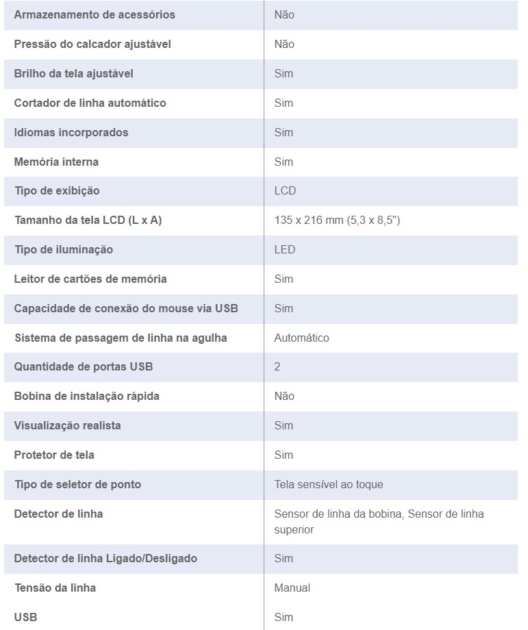 | Pressão do calcador ajustável | Não |