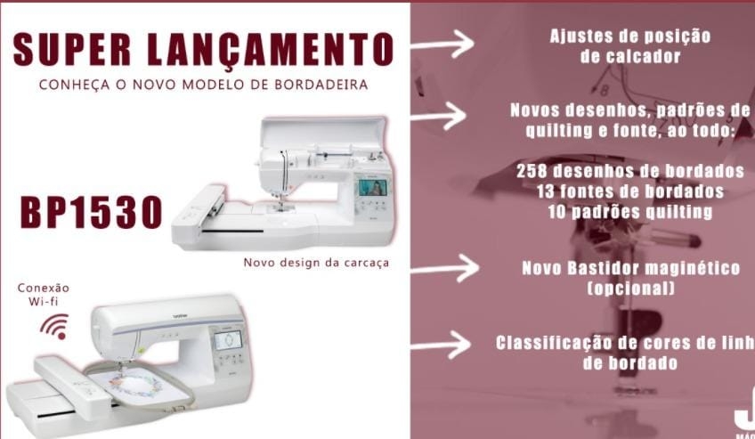 Leve o seu bordado para o próximo nível com a empolgante Máquina de Bordado Brother BP1530L, agora com sistema Wi-Fi, oferecendo mais facilidade na passagem de desenhos de bordados.