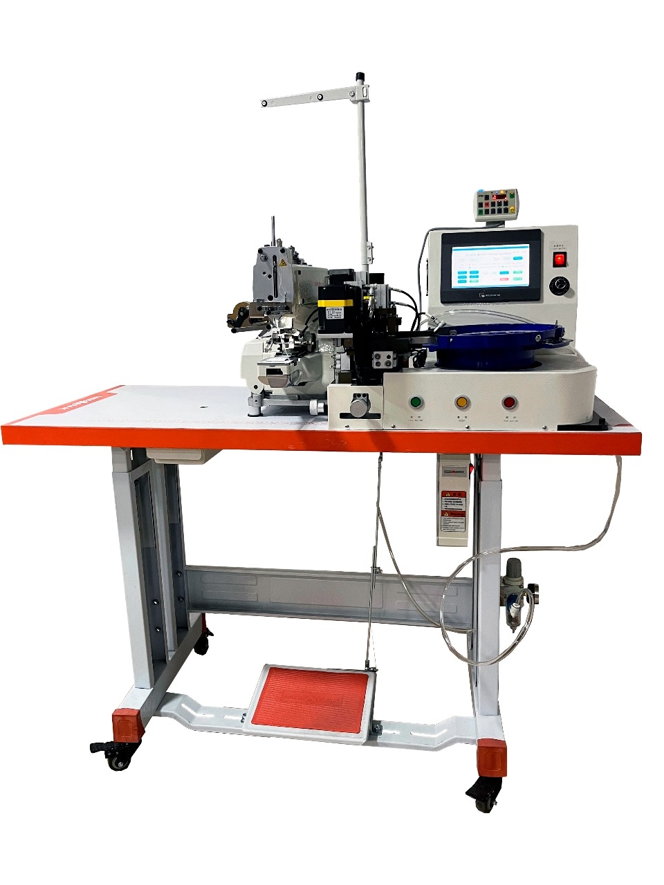 Máquina de costura industrial botoneira de ponto corrente para pregar botões de 2 e 4 furos, com corte de linha automático para uso em todos os tipos de tecidos.