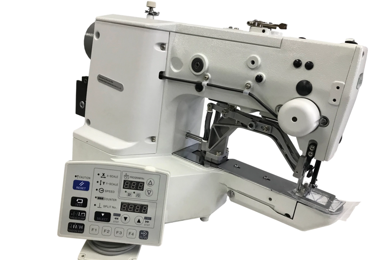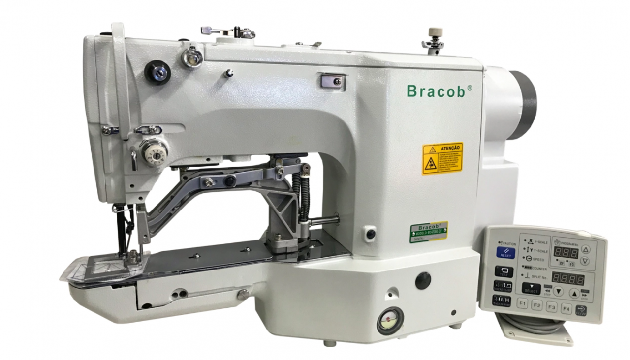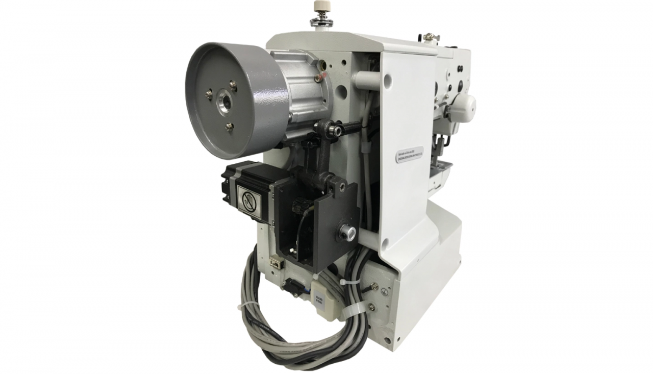 Máquina de costura industrial travete direct drive e eletrônica programável para tecidos médios a pesados.