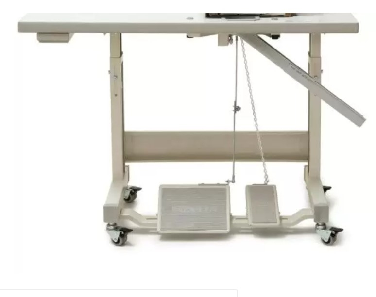 Máquina de Costura Completa com mesa fórmica, pé de ferro e motor acoplado ao cabeçote.