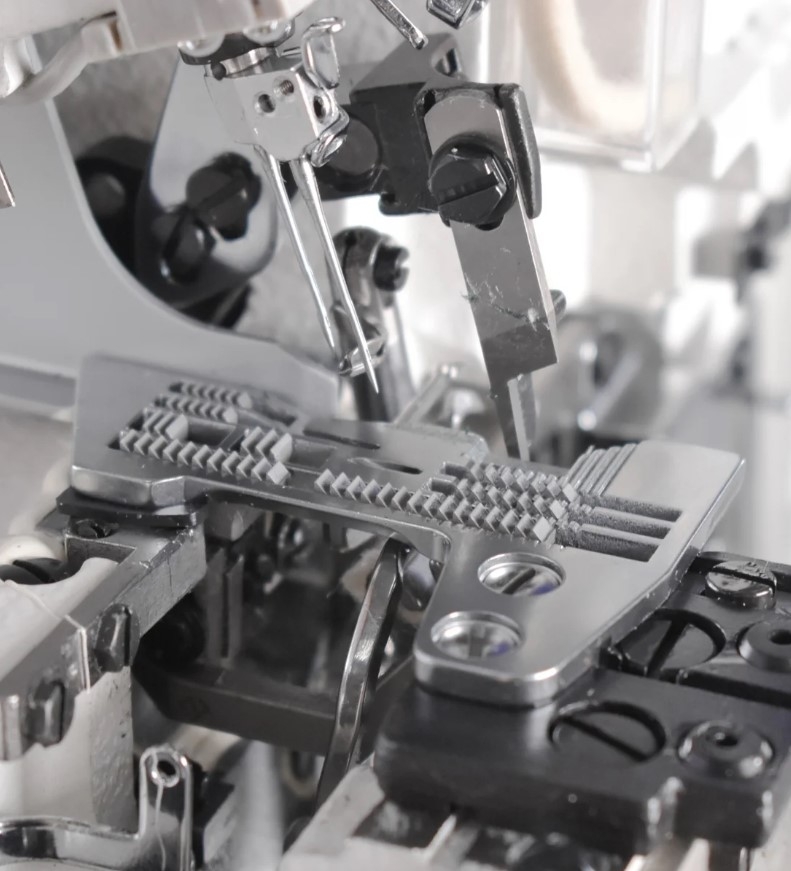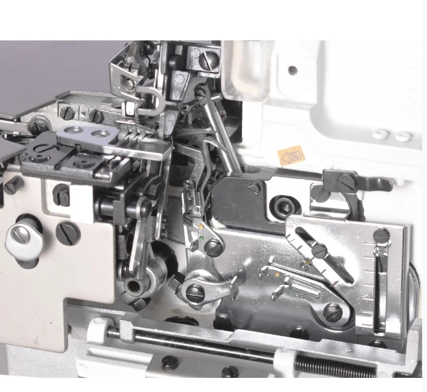 Máquina Interloque médio 2 agulhas e 5 linhas com motor servo eletrônico, control box e painel de comando embutido no cabeçote facilitando a sua montagem.