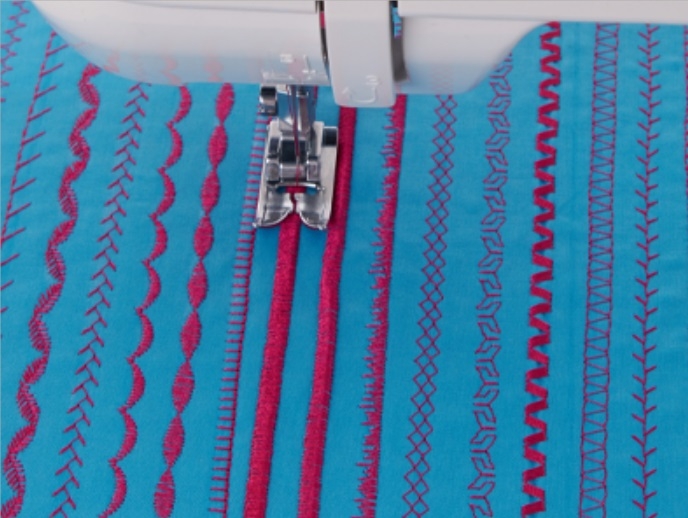 30 tipos de pontos de costura incluindo 1 modelo de caseado de botão, 4 pontos de aplique tipo caseadinho para patchwork e 3 pontos decorativos tipo satin (ponto cheio)