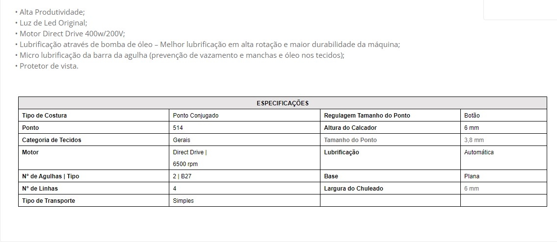 * Micro lubrificação da barra da agulha (prevenção de vazamento e manchas e óleo nos tecidos);