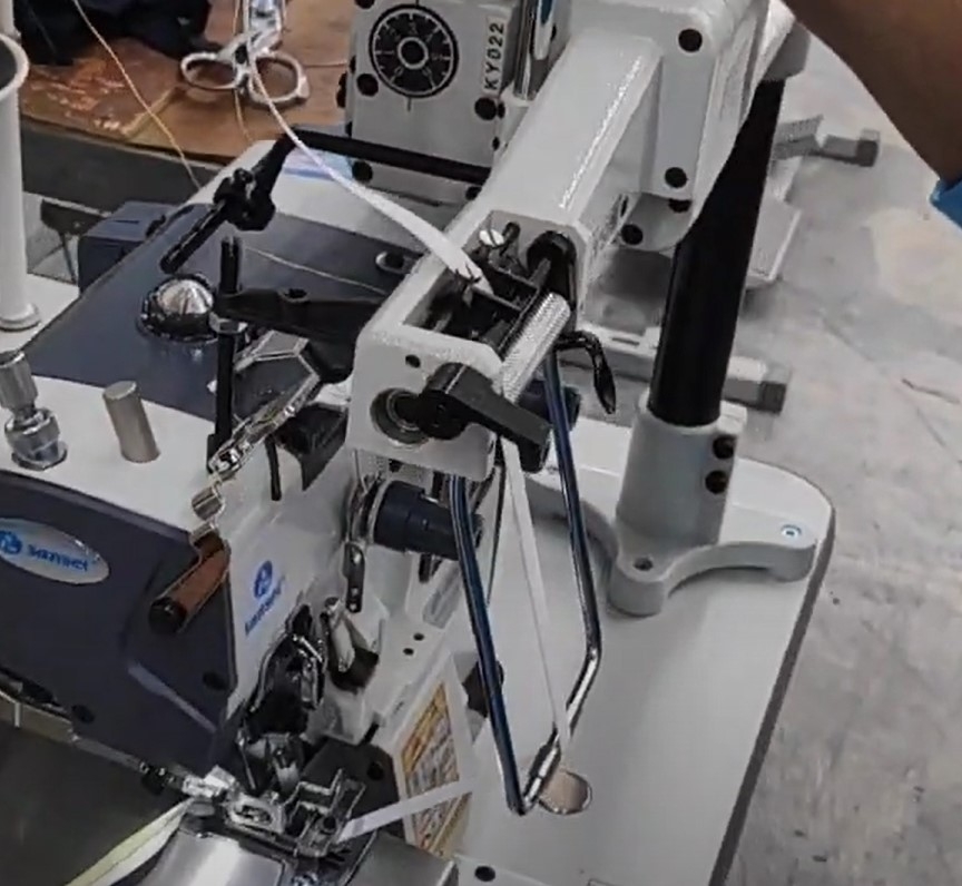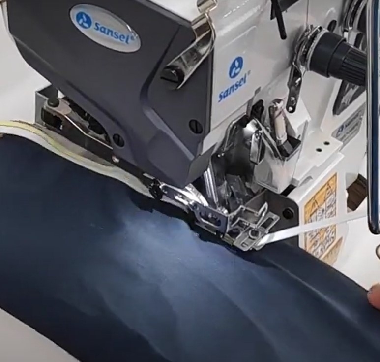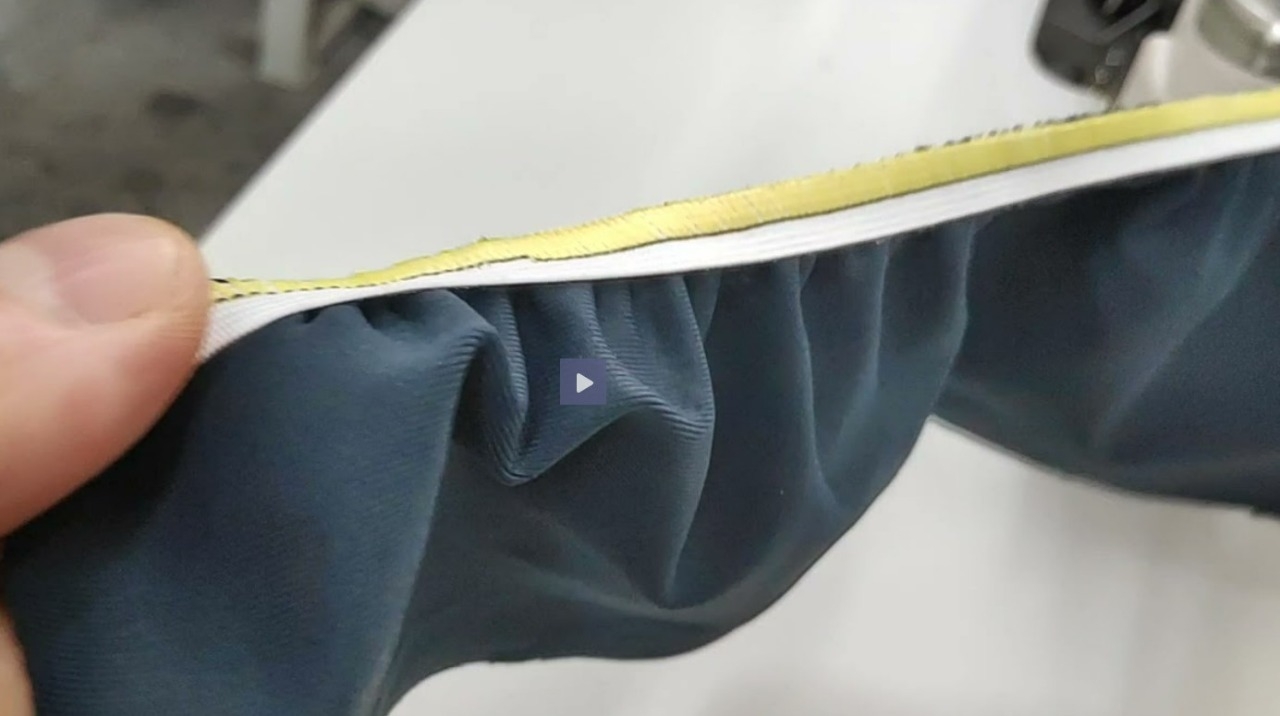 Equipada com aparelho Zeromax mecânico acoplado ao cabeçote, que tensiona e embute elástico na costura do overloque.