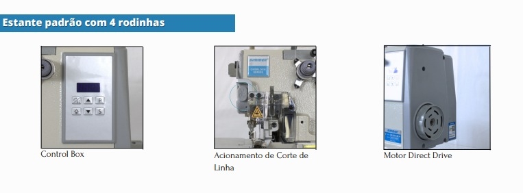 11 - Velocidade programável (a operadora ajusta a velocidade através de teclas no painel de comando) - as máquinas com motores convencionais são fabricadas para trabalhar na média de 5.000 RPM e para mudar a velocidade é necessária a troca da polia e reajuste da correia, o que demanda mais tempo.