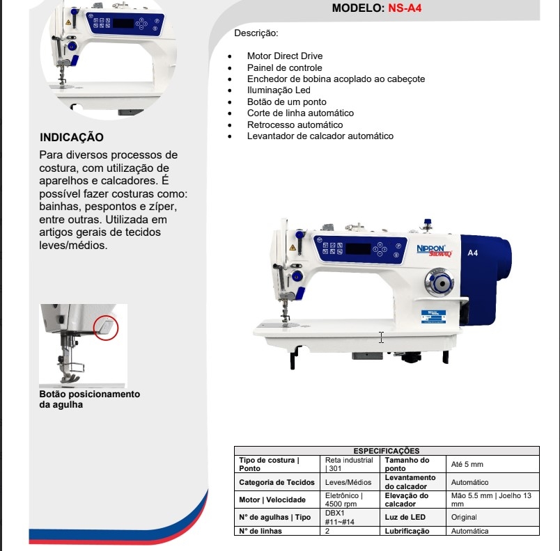 Máquina De Costura Reta Eletrônica Direct Drive - Nippon NS-A4