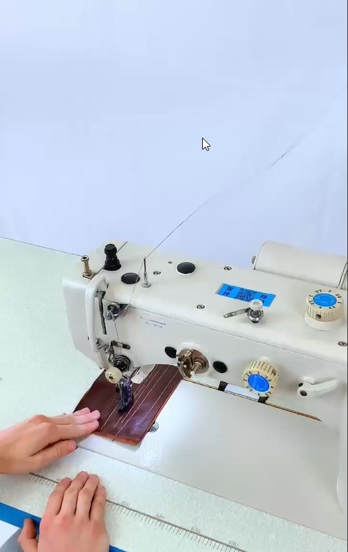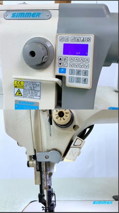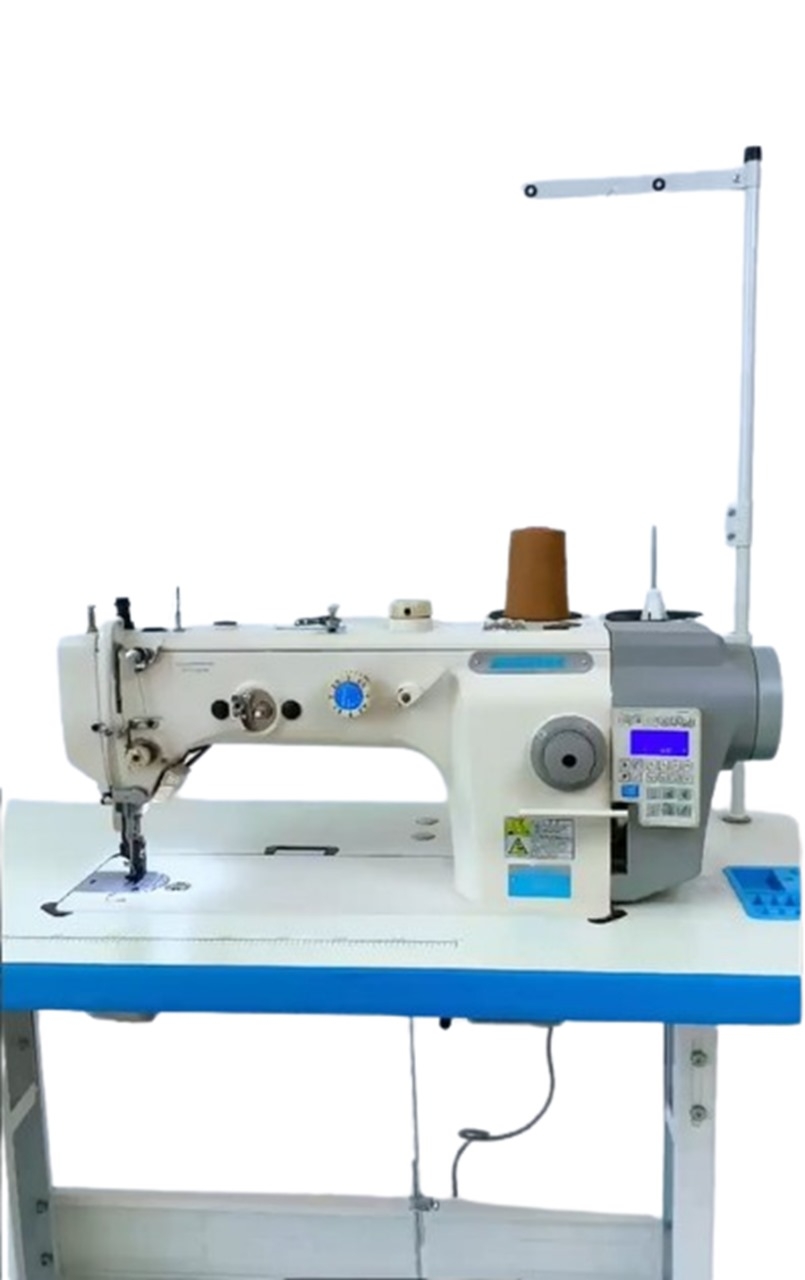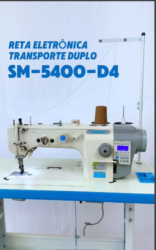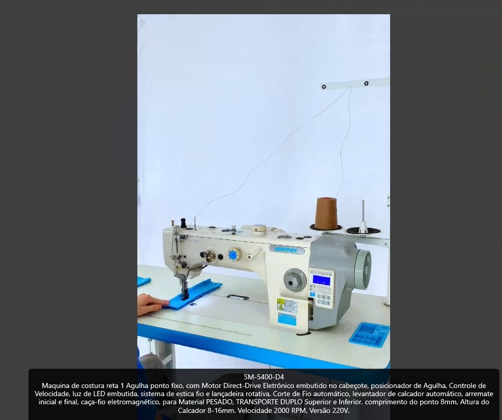 Maquina de costura reta 1 Agulha ponto fixo, com Motor Direct-Drive Eletrônico embutido no cabeçote, posicionador de Agulha, Controle de Velocidade, luz de LED embutida, sistema de estica fio e lançadeira rotativa, Corte de Fio automático, levantador de calcador automático, arremate inicial e final, caça-fio eletromagnético, para Material PESADO, TRANSPORTE DUPLO Superior e Inferior, comprimento do ponto 8mm, Altura do Calcador 8-16mm. Velocidade 2000 RPM, Versão 220V.