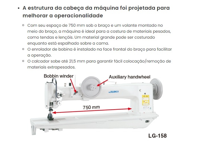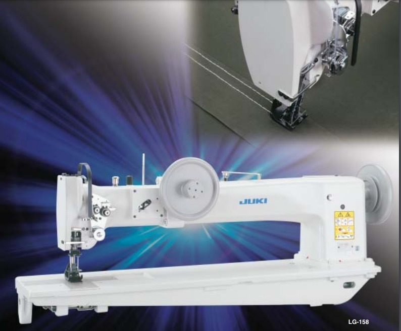 A Juki LG-158 é a maior máquina de braço longo que a Juki fabrica. Existem tantas opções disponíveis que o custo realmente depende do seu produto. Também pode ser o serviço mais pesado da linha Juki. Tem um ponto fixo de braço longo de avanço uníssono com eixo vertical, com um gancho grande. O corpo é um retrocesso aos estilos mais antigos. Não possui cortador de linha automático ou motor de acionamento direto interno. É mais simplista. No entanto, este é o modelo de maior qualidade que você pode obter se o tamanho for sua principal preocupação.