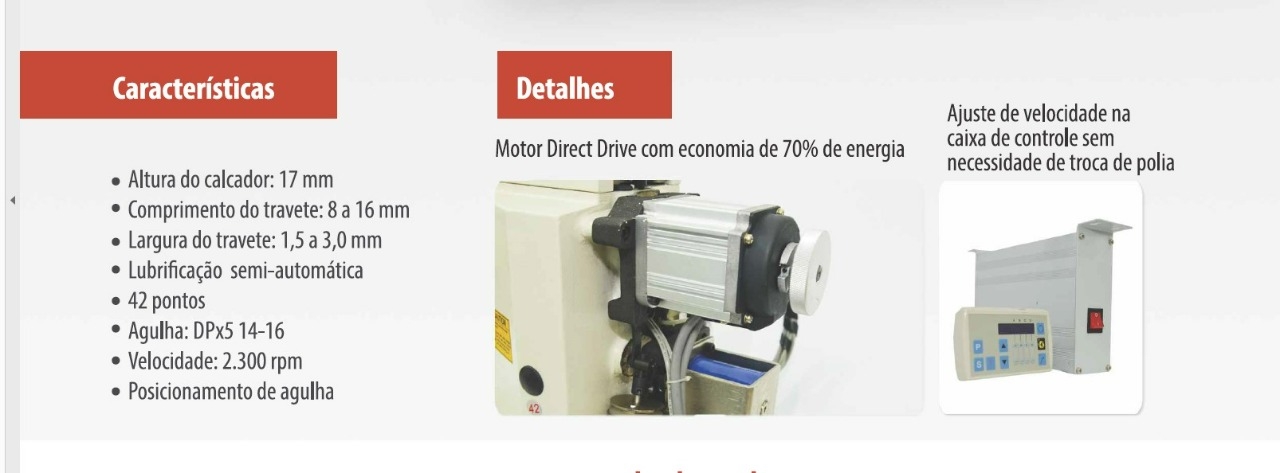 Máquina travete com motor direct driver, 1 agulha, ponto fixo, corte e limpador de linha sincronizados com o levantador de calcador.