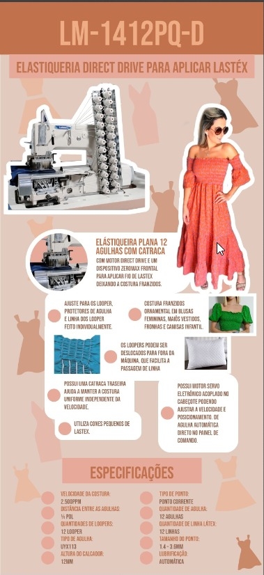 Elastiqueira plana de 12 agulhas com catraca, motor Direct Drive e dispositivo zeromax frontal para aplicar fio de lastex para costurar franzidos ornamentais em blusas femininas, maiôs vestidos, fronhas e camisa infantil.
