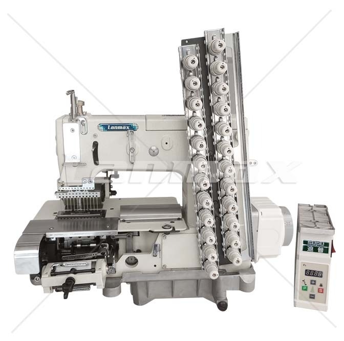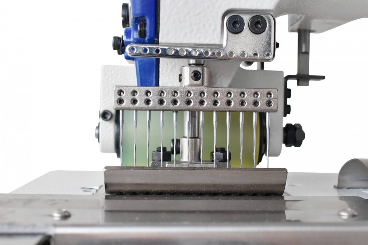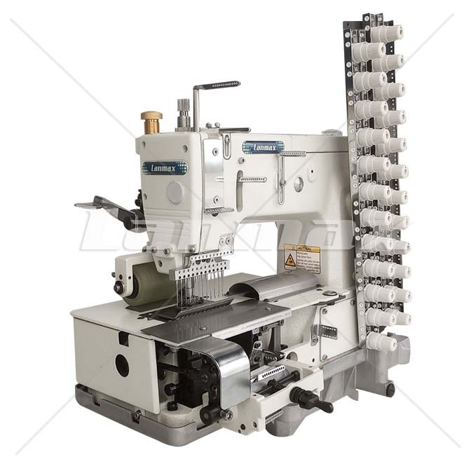 Elastiqueira plana de 12 agulhas com catraca, motor direct drive e um dispositivo zeromax frontal para aplicar fio de lastex para costurar franzidos ornamentais em blusas femininas, maiôs vestidos, fronhas e camisa infantil.