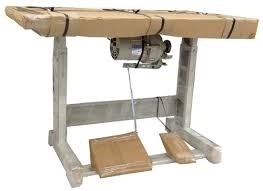 Estante desmontada composta por: Tampo de madeira revestido em fórmica impermeável, Pé de ferro pintado por imersão, motor 1/2hp e acessórios para manutenção.