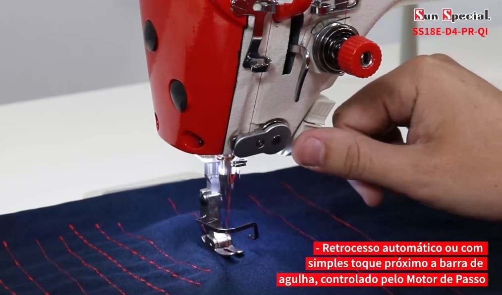 Retrocesso Automático ou com simples toque próximo barra de agulha, controlado pelo Motor de Passo