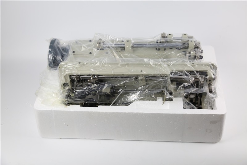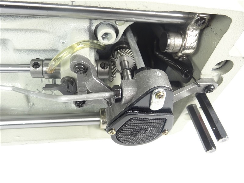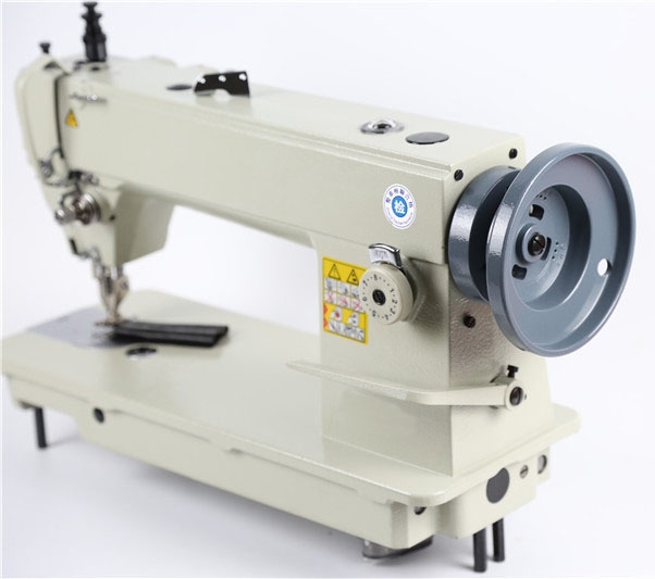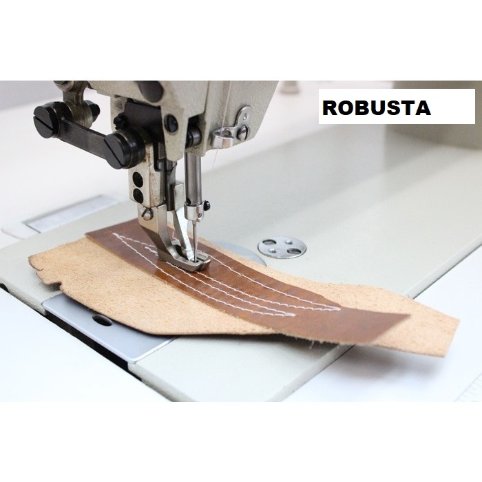 Máquina reta industrial com 1 agulha e ponto fixo. Possui lançadeira grande (Jumbo) e Transporte Duplo por dente e calcador, o qual otimiza o transporte de tecidos pesados.