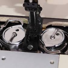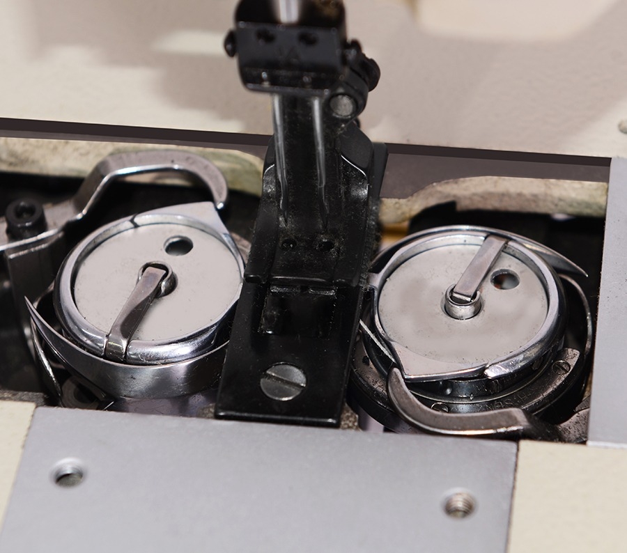 Pespontadeira de 02 agulhas, transporte triplo (dente, agulha e calcador), lançadeira grande vertical e ponto 9mm.