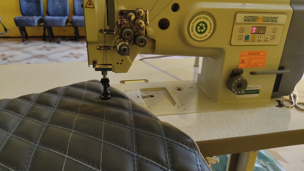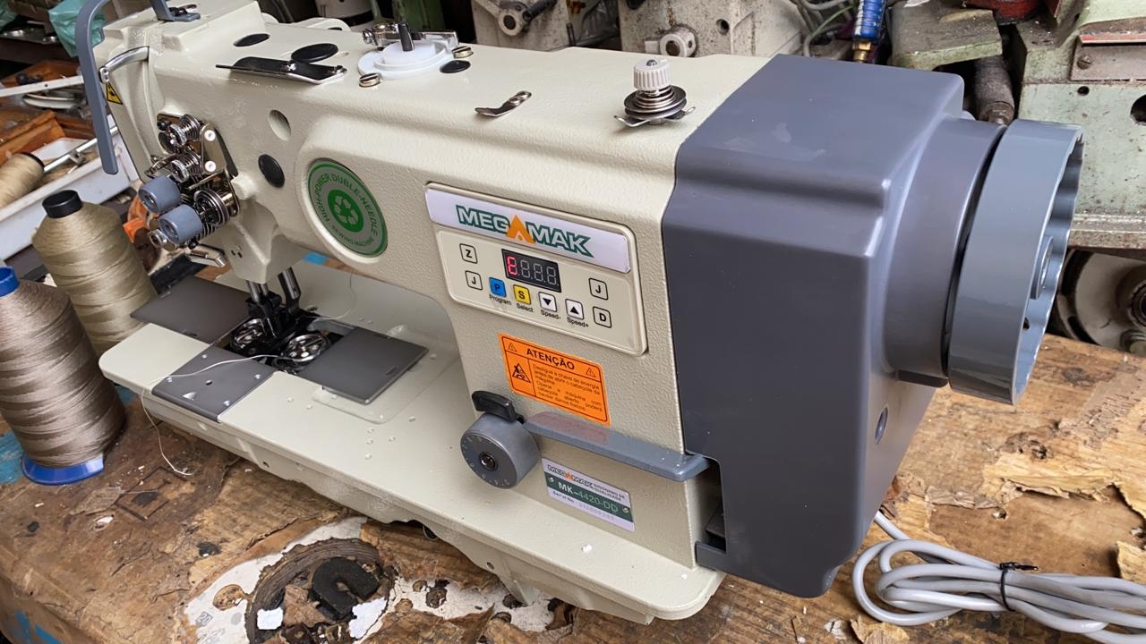 Máquina Reta 2 Agulhas com ponto fixo, lubrificação automática e transporte triplo por Dente calcador e agulha (evita o franzimento do tecido), indicada para materiais pesados como estofados, couros, lonas, sintéticos entre outros.
