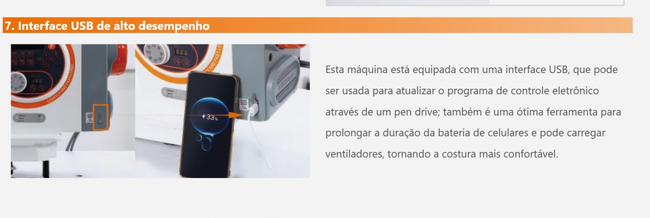 Esta máquina está equipada com uma interface USB, que pode ser usada para atualizar o programa de controle eletrônico através de um pen drive; também é uma ótima ferramenta para prolongar a duração da bateria de celulares e pode carregar ventiladores, tornando a costura mais confortável.