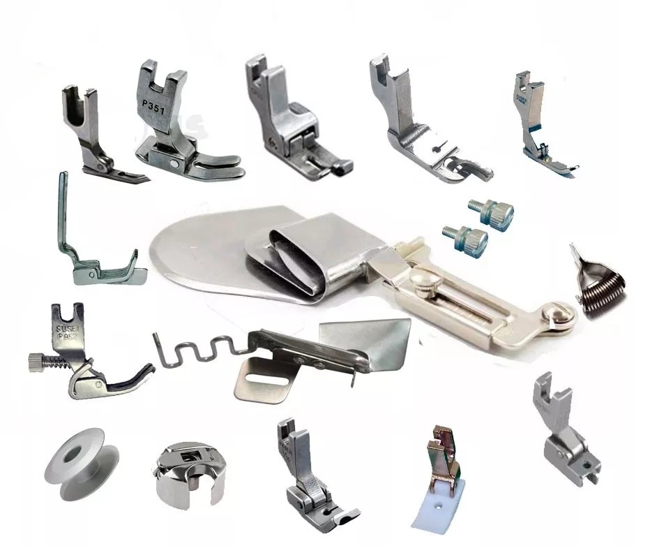 Eles são mais conhecidos como ''pézinho de máquina'', mas seu nome técnico chama-se ''pé calcador''. O pé calcador é encaixado na ''barra do pé calcador'', geralmente parafusado ou encaixado. Ele dá sustento ao tecido no momento da costura e também serve de guia para uma costura bem feita.