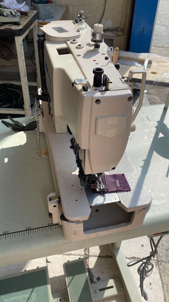 Máquina de costura industrial tipo caseadeira com mesa, estante e motor.