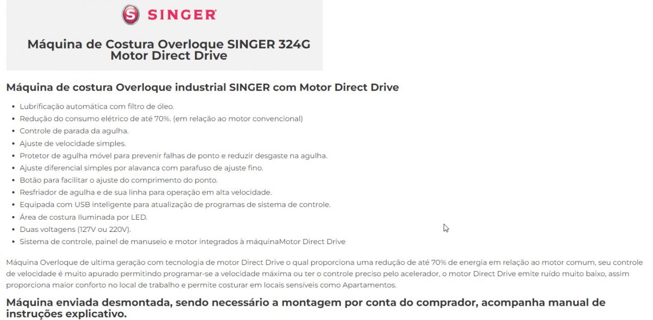 Máquina Overloque de ultima geração com tecnologia de motor Direct Drive o qual proporciona uma redução de até 70% de energia em relação ao motor comum, seu controle de velocidade é muito apurado permitindo programar-se a velocidade máxima ou ter o controle preciso pelo acelerador, o motor Direct Drive emite ruído muito baixo, assim proporciona maior conforto no local de trabalho e permite costurar em locais sensíveis como Apartamentos.