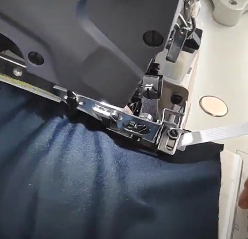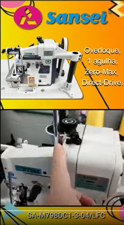 Equipada com aparelho Zeromax mecânico acoplado ao cabeçote, que tensiona e embute elástico na costura do overloque.