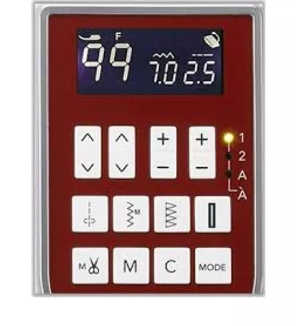 -Painel LCD com informações de tipo de ponto selecionado, calcador indicado, largura do ponto e comprimento do ponto