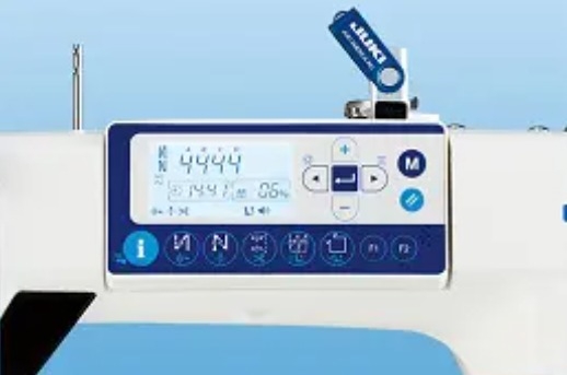 Máquina de costura reta eletrônica para trabalhar materiais leves e médios, com painel digital acoplado à maquina que permite ajustes e configurações ou análise de dados e gerenciamentos gerais, tudo de maneira praticamente intuitiva e facilitada.