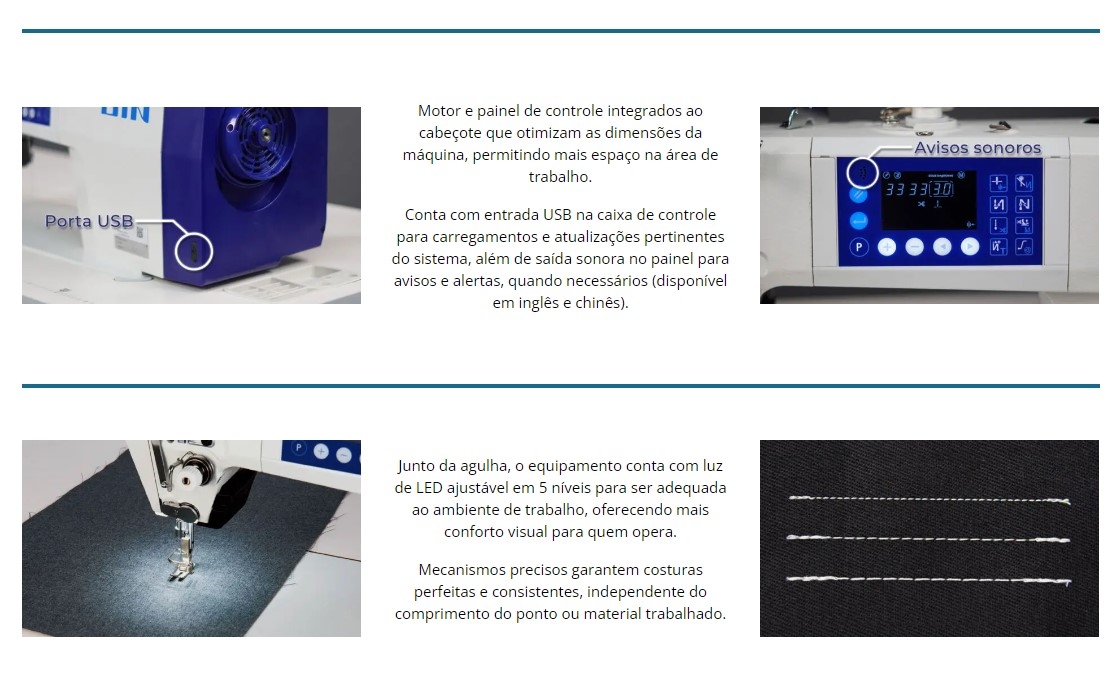 Mecanismos precisos garantem costuras perfeitas e consistentes, independente do comprimento do ponto ou material trabalhado
