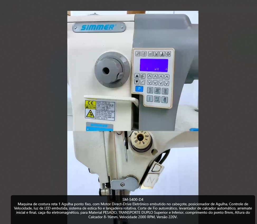 Maquina de costura reta 1 Agulha ponto fixo, com Motor Direct-Drive Eletrônico embutido no cabeçote, posicionador de Agulha, Controle de Velocidade, luz de LED embutida, sistema de estica fio e lançadeira rotativa, Corte de Fio automático, levantador de calcador automático, arremate inicial e final, caça-fio eletromagnético, para Material PESADO, TRANSPORTE DUPLO Superior e Inferior, comprimento do ponto 8mm, Altura do Calcador 8-16mm. Velocidade 2000 RPM, Versão 220V.
