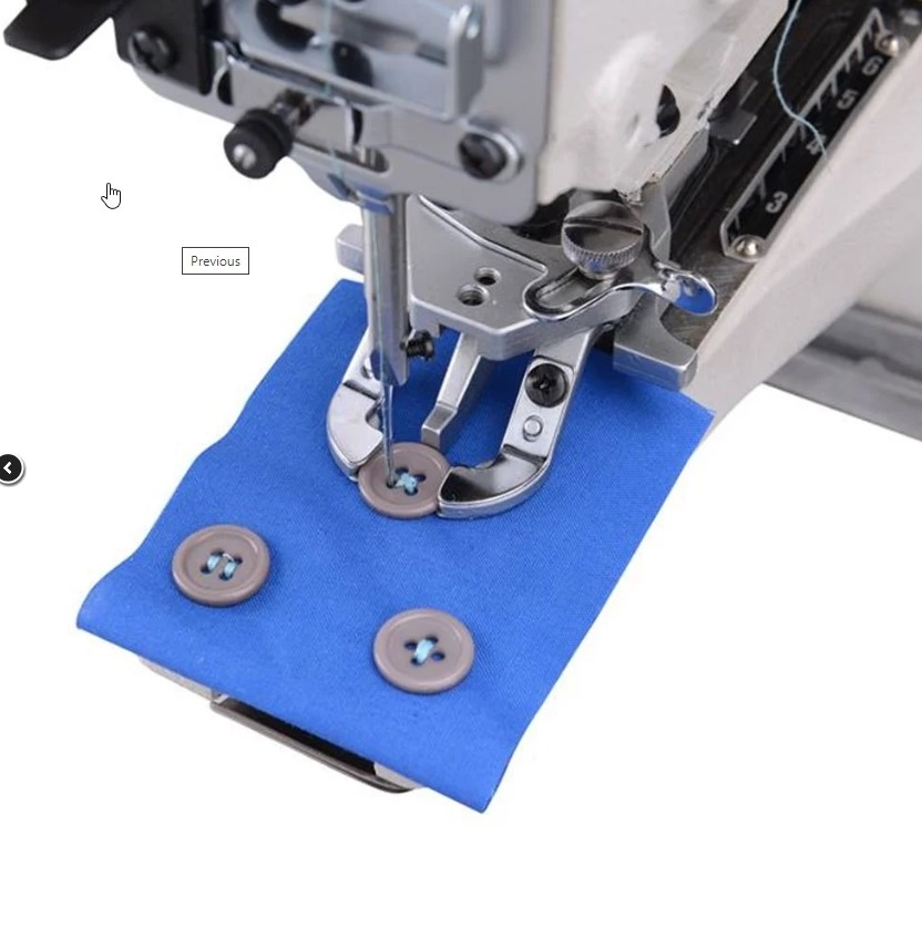 Maquina de costura tipo pregadeira de botão direta drive, ponto corrente, sistema para aplicar botões 2 e 4 furos e "X", diâmetro do botão de 10 a 28MM, altura do levantamento de calcador até 9MM, velocidade de 1.500RPM, caixa de comando e painel acoplados diretamente ao cabeçote da maquina, com corte de linha, com mesa e estante com rodinhas.