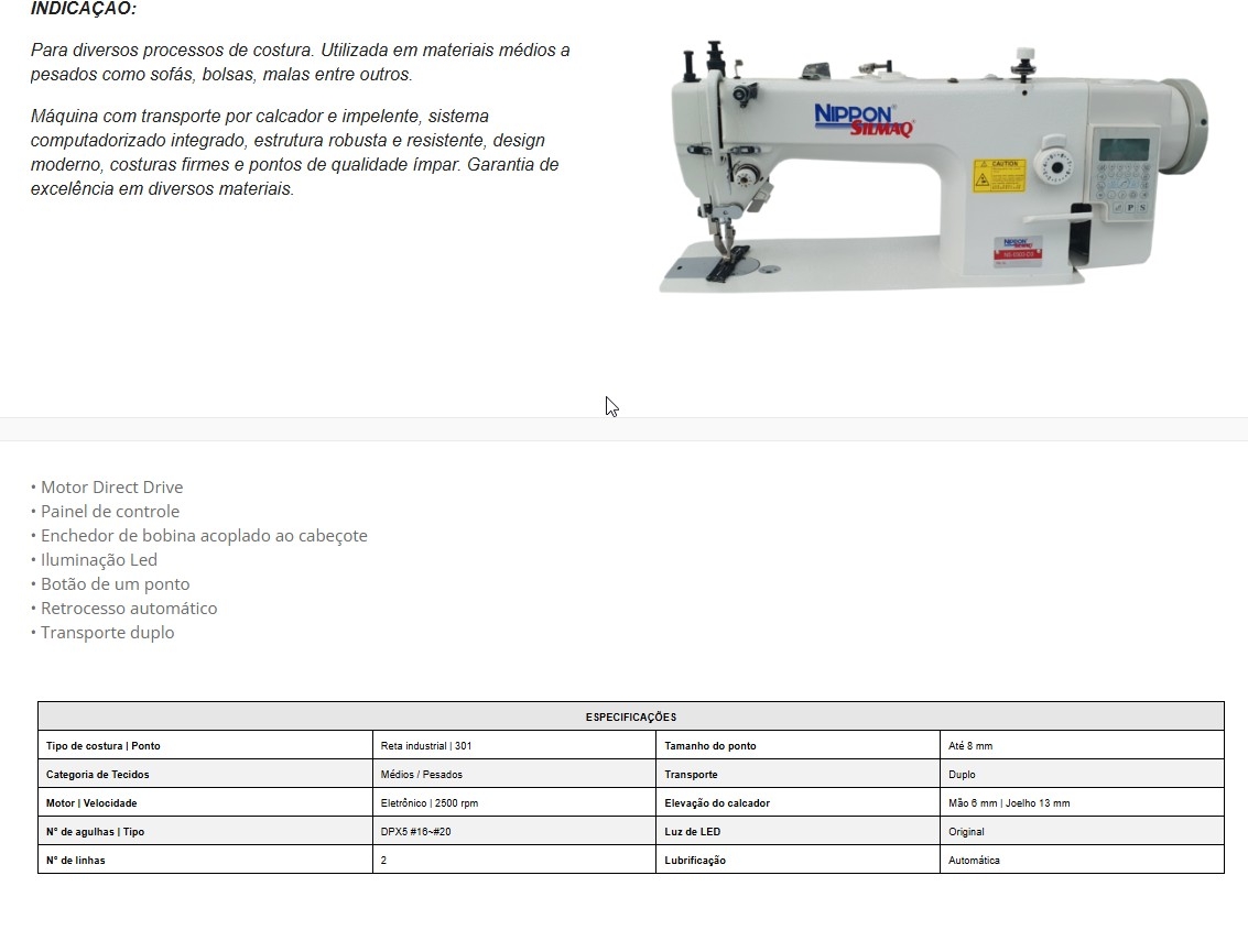 Máquina com transporte por calcador e impelente, sistema computadorizado integrado, estrutura robusta e resistente, design moderno, costuras firmes e pontos de qualidade ímpar. Garantia de excelência em diversos materiais.