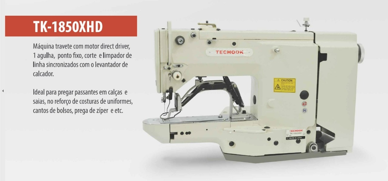 Máquina travete com motor direct driver, 1 agulha, ponto fixo, corte e limpador de linha sincronizados com o levantador de calcador.