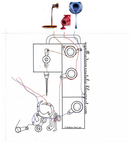 Funciona com uma agulha e três linhas.