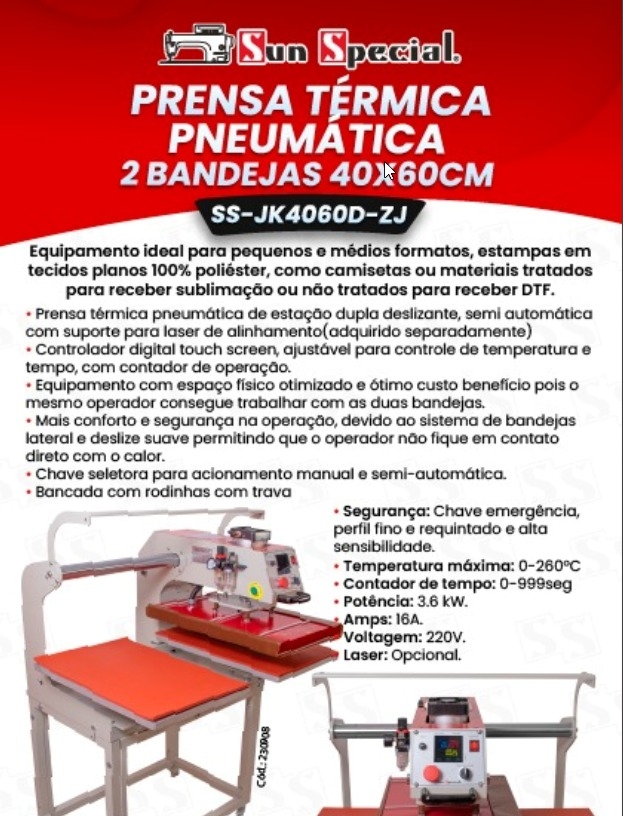 Prensa Pneumatica 40x60cm com 2 Bandejas Semiautomática SS-JK4060D-ZJ - Sun Special
