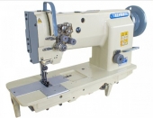 Reta duas agulhas, transporte triplo (dente / agulha / calcador), lançadeira grande vertical e lubrificação automática. Utilizada na confecção de bolsas, cintos, carteiras, luvas, jaquetas, fichários, materiais de segurança e artigos em couro.Vantagens: A lançadeira vertical foi projetada para trabalhar com agulha e linha de espessura grossa, ideal para costurar materiais pesados e artigos em couro. Sua lançadeira grande tem a capacidade de armazenar até 50% a mais de linha do que uma lançadeira pequena. Seu sistema vertical permite que a regulagem mecânica e o encaixe da bobina sejam feitos com mais facilidade e rapidez.