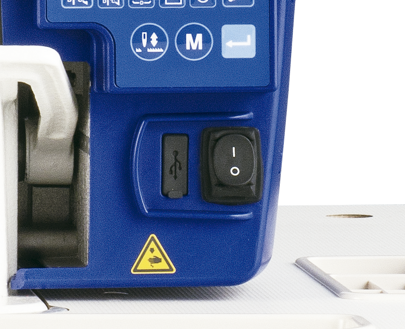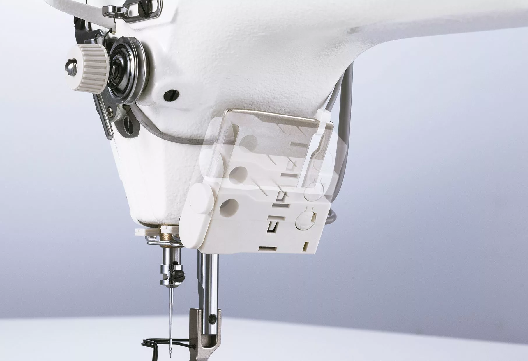 Para facilitar ainda mais a operação, esta máquina reta possui iluminação LED na área de entrada da agulha nos dois lados da barra, que pode ser ajustada em cinco etapas e também serve como luz auxiliar durante a costura. O controle do ângulo do eixo principal evita a quebra da agulha mesmo no processo de arremate e a altura do calcador é ajustável de acordo com a espessura dos materiais.