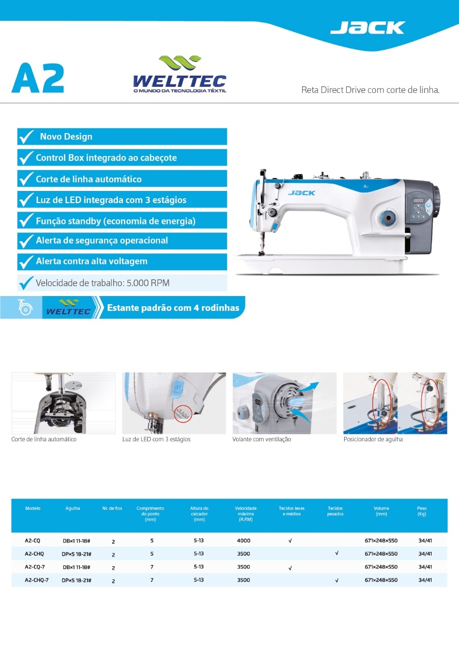 A nova Jack A2 é uma máquina de costura reta industrial, com 1 agulha, motor direct drive, equipada com função automática de posicionamento de agulha, controle de velocidade, CORTE DE LINHA e possui painel com display digital acoplados ao corpo da máquina.